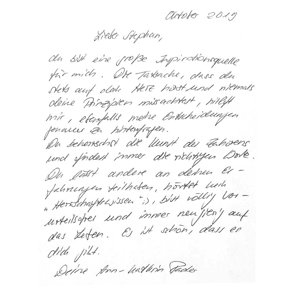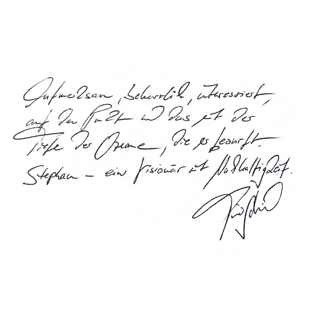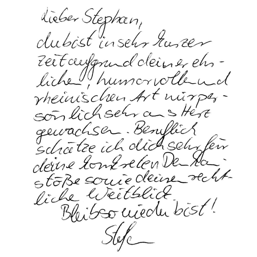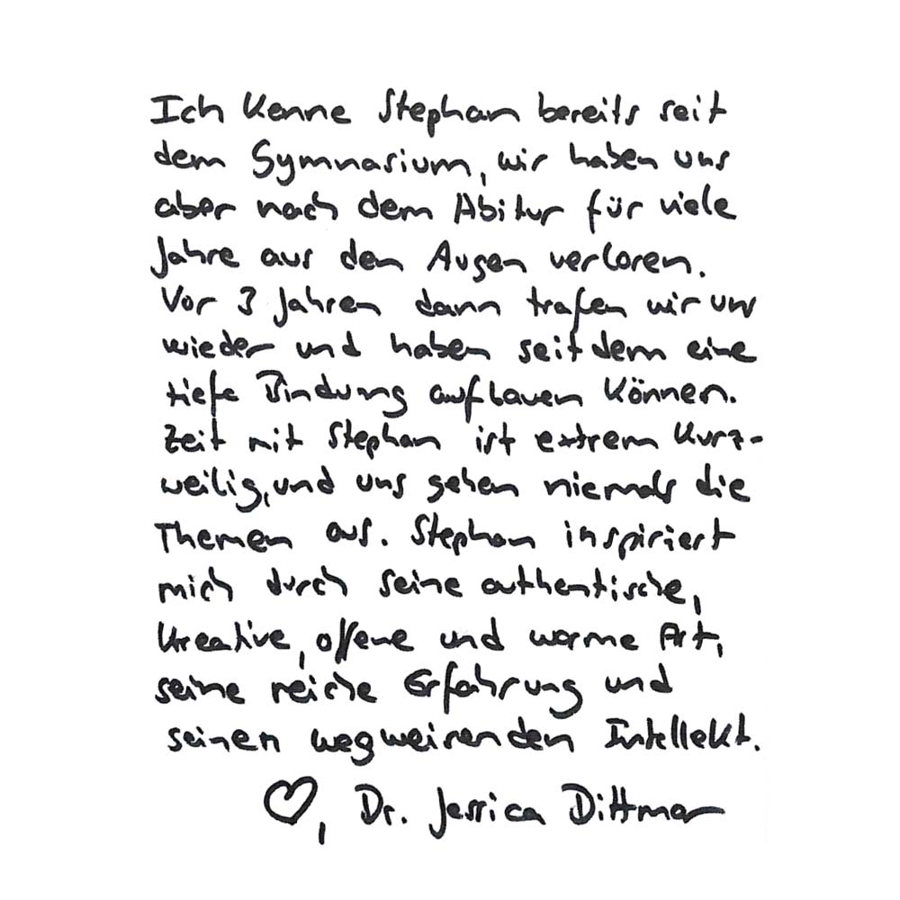 Ich kenne Stephan bereits seit dem Gymnasium, wir haben uns aber nach dem Abitur für viele Jahre aus den Augen verloren. Vor 3 Jahren dann trafen wir uns wieder und haben seitdem eine tiefe Bindung aufbauen können. Zeit mit Stephan ist extrem kurzweilig, und uns gehen niemals die Themen aus. Stephan inspiriert mich durch seine authentische, kreative, offene und warme Art, seine reiche Erfahrung und seinen wegweisenden Intellekt.