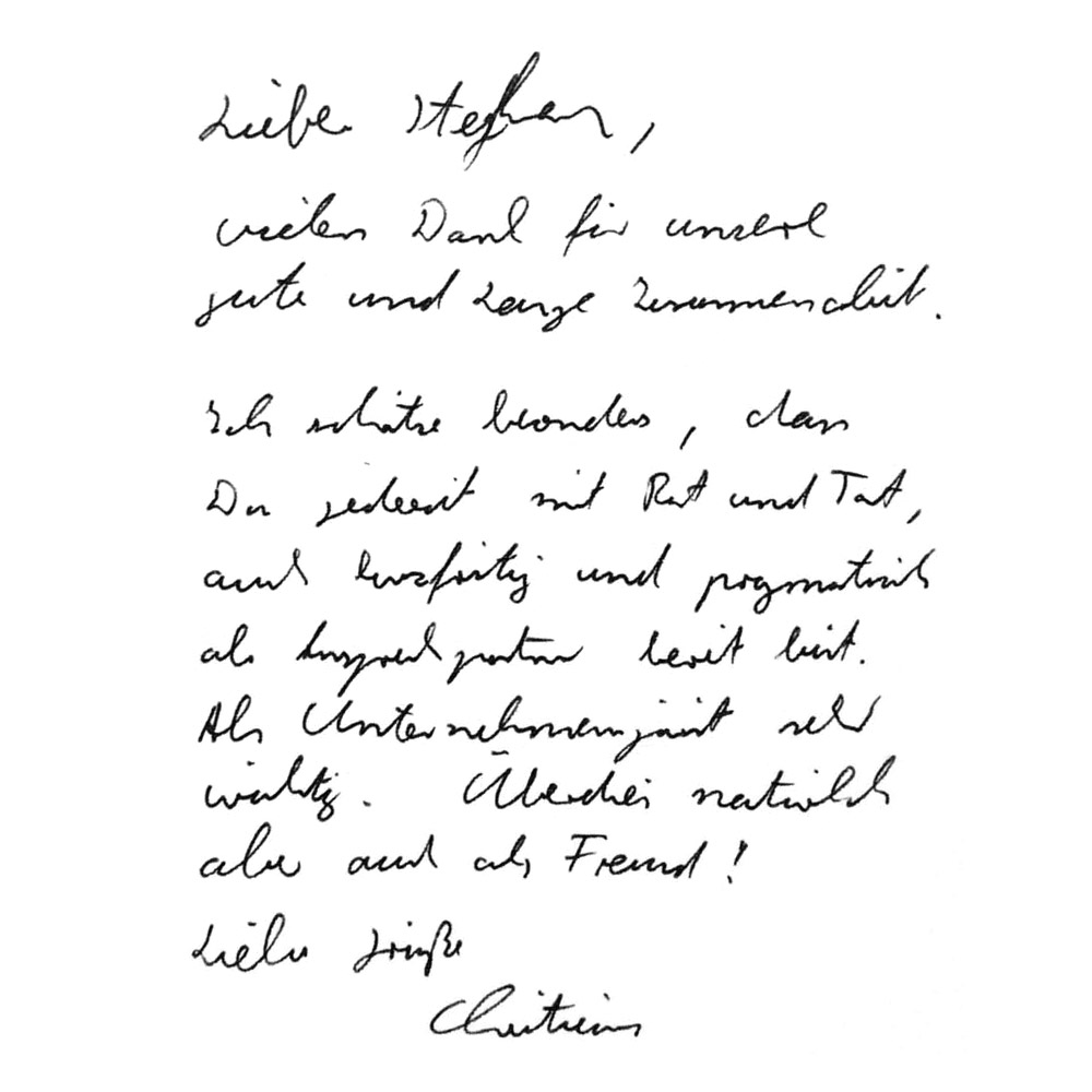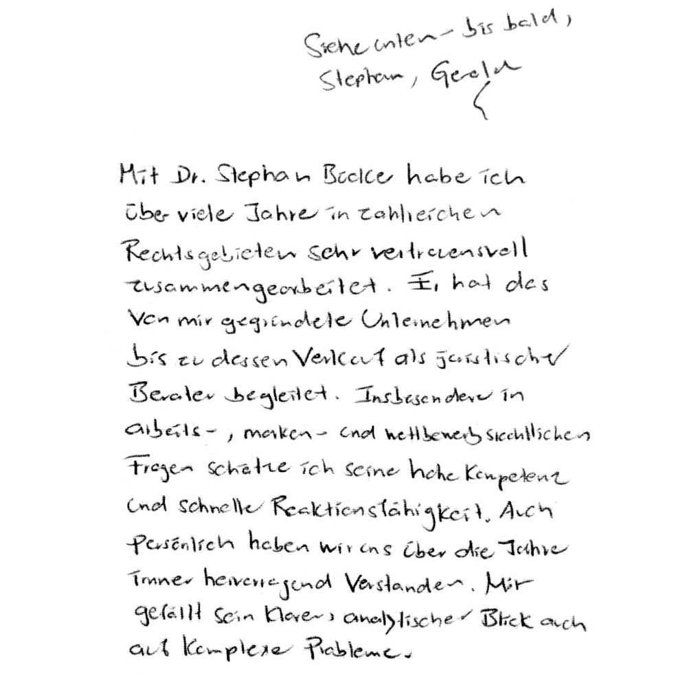 vielen Dank für unsere gute und lange Zusammenarbeit. Ich schätze besonders, dass Du jederzeit mit Rat und Tat, auch kurzfristig und pragmatisch als Gesprächspartner bereit bist. Als Unternehmensjurist sehr wichtig . Überdies natürlich aber auch als Freund!