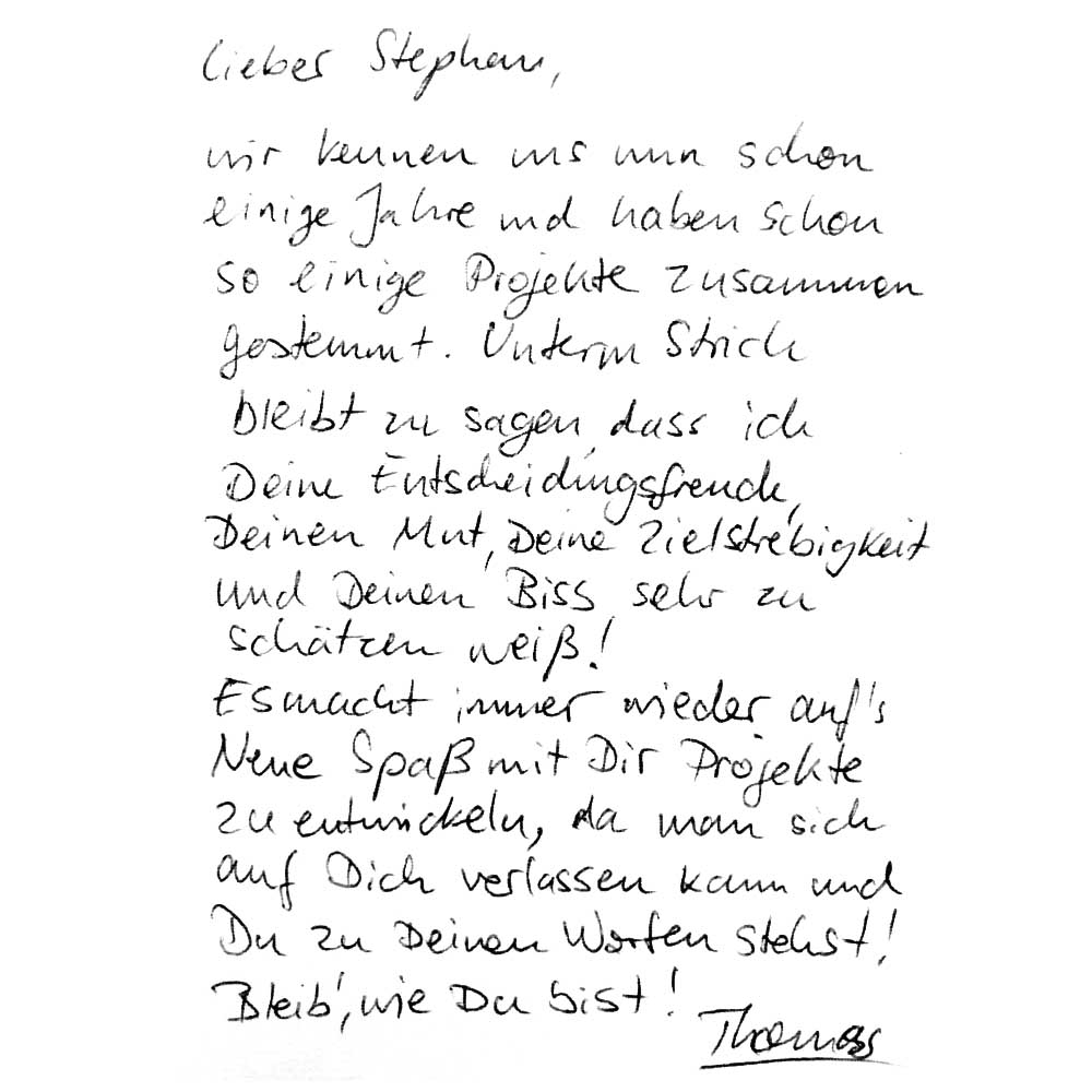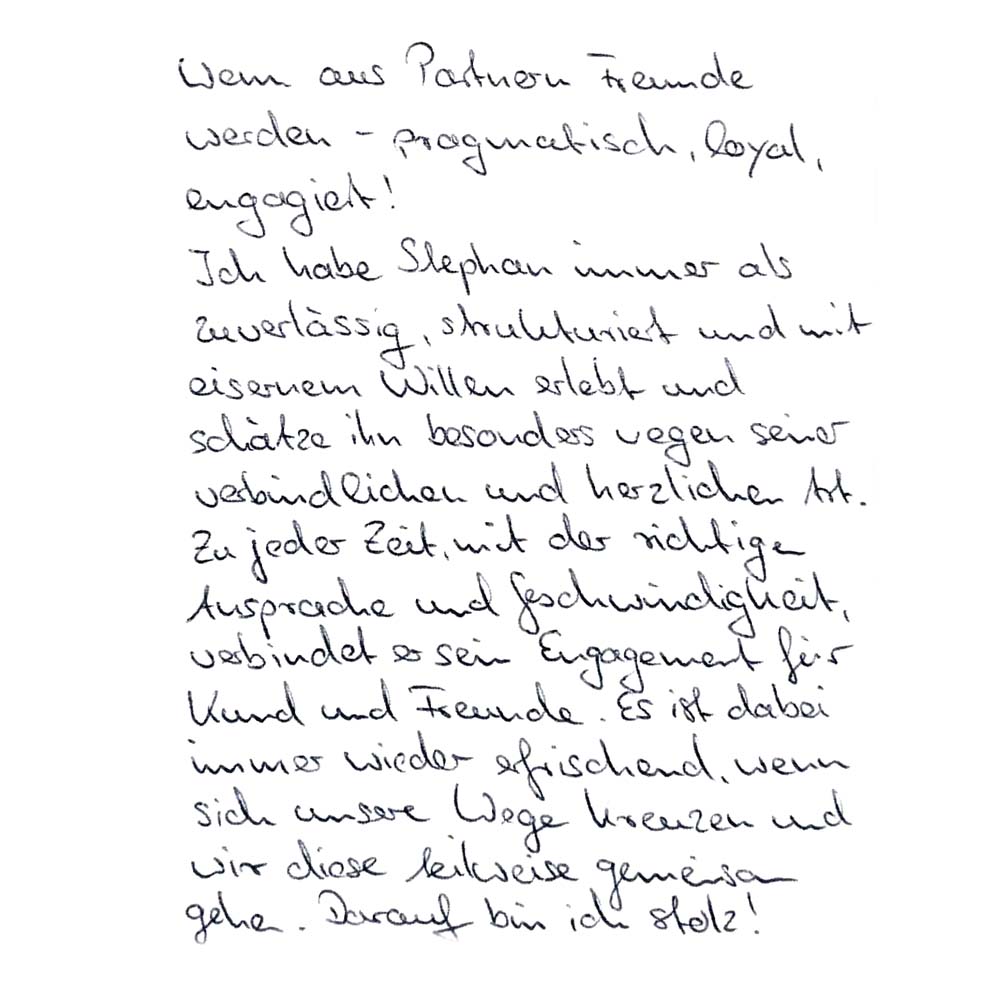 Wenn aus Partnern Freunde werden – pragmatisch, loyal, engagiert! Ich habe Stephan immer als zuverlässig, strukturiert und mit eisernem Willen erlebt und schätze ihn besonders wegen seiner verbindlichen und herzlichen Art. Zu jeder Zeit, mit der richtigen Ansprache und Geschwindigkeit, verbindet er sein Engagement für Kunden und Freunde. Es ist dabei immer wieder erfrischend, wenn sich unsere Wege kreuzen und wir diese zeitweise gemeinsam gehen. Darauf bin ich stolz!