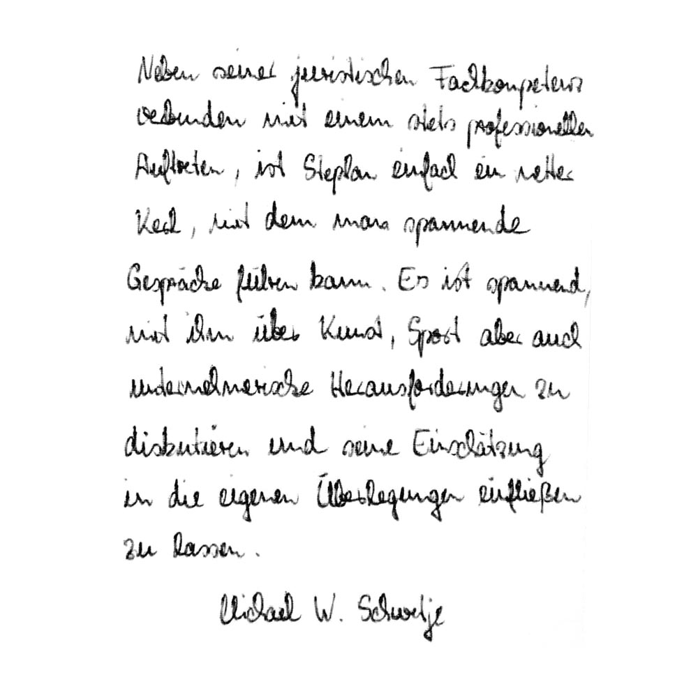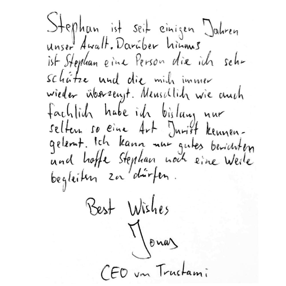 Stephan ist seit einigen Jahren unser Anwalt. Darüber hinaus ist Stephan eine Person, die ich sehr schätze und die mich immer wieder überzeugt. Menschlich wie auch fachlich habe ich bislang nur selten so eine Art Jurist kennengelernt. Ich kann nur Gutes berichten und hoffe Stephan noch eine Weile begleiten zu dürfen.