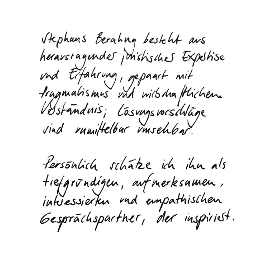 Stephans Beratung besteht aus hervorragender juristischer Expertise und Erfahrung, gepaart mt Pragmatismus und wirtschaftlichem Verständnis; Lösungsvorschläge sind unmittelbar umsetzbar.