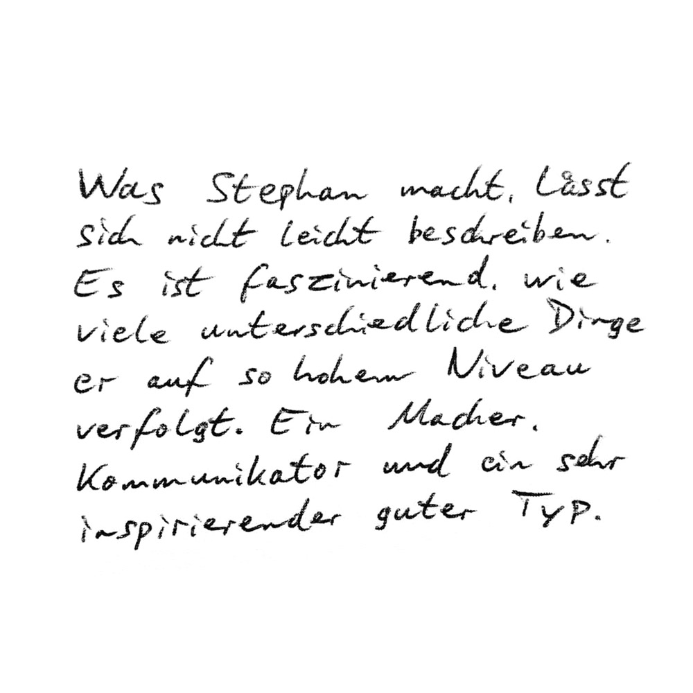 Was Stephan macht, lässt sich nicht leicht beschreiben. Es ist faszinierend, wie viele unterschiedliche Dinge er auf so hohem Niveau verfolgt. Ein Macher, Kommunikator und ein sehr inspirierender guter Typ.