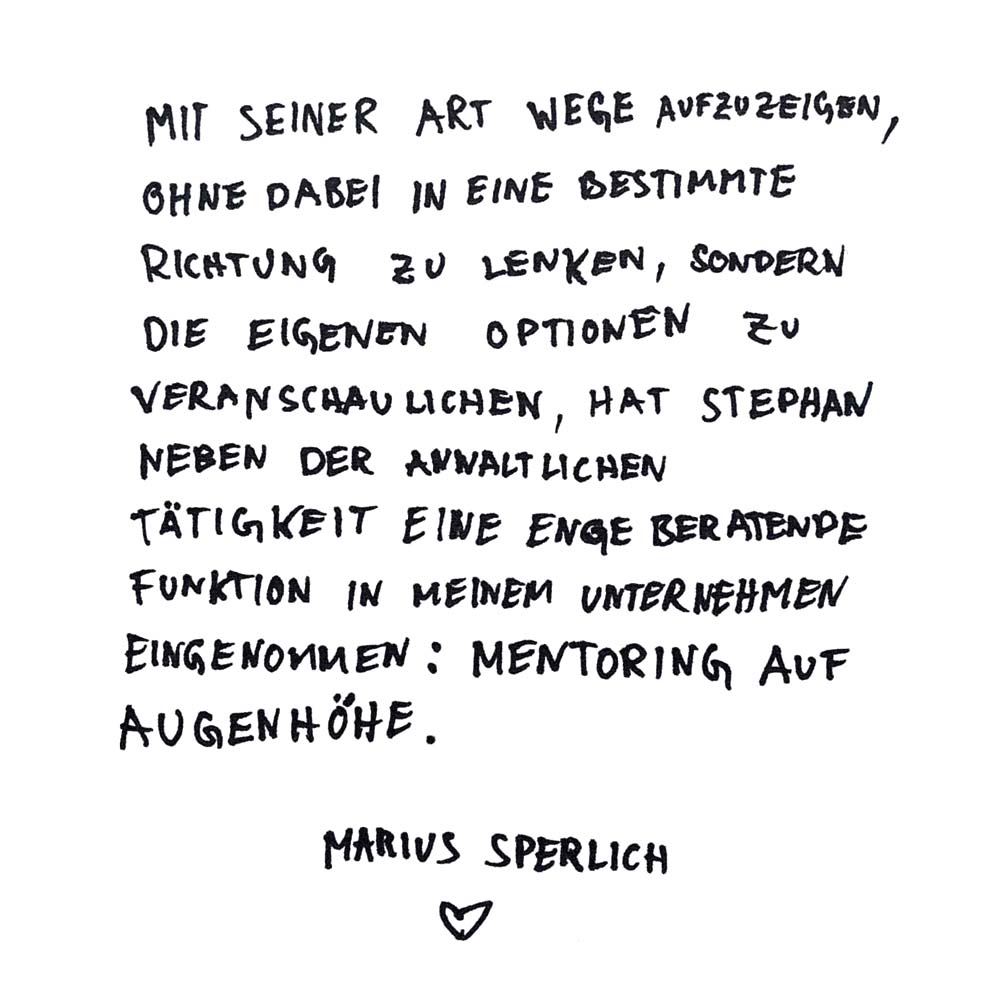 Mit seiner Art Wege aufzuzeigen, ohne dabei in eine bestimmte Richtung zu lenken, sondern die eigenen Optionen zu veranschaulichen, hat Stephan neben der anwaltlichen Tätigkeit eine enge beratende Funktion in meinem Unternehmen eingenommen: Mentoring auf Augenhöhe.