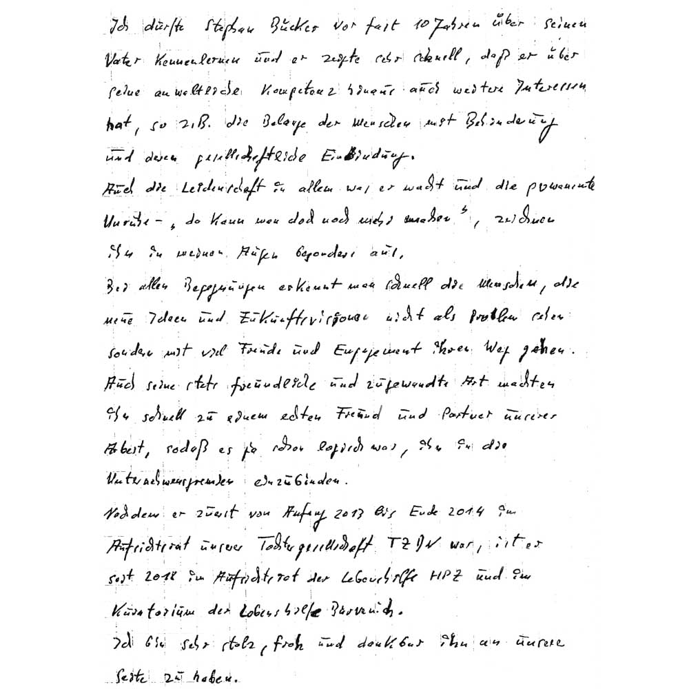 Auch die Leidenschaft in allem was er macht und die permanente Unruhe – ‚da kann man doch noch mehr machen‘, zeichnen ihn in meinen Augen besonders aus. […] Auch seine stets freundliche und zugewandte Art machten ihn schnell zu einem echten Freund und Partner unserer Arbeit, […] Ich bin sehr stolz, froh und dankbar ihn an unserer Seite zu haben.