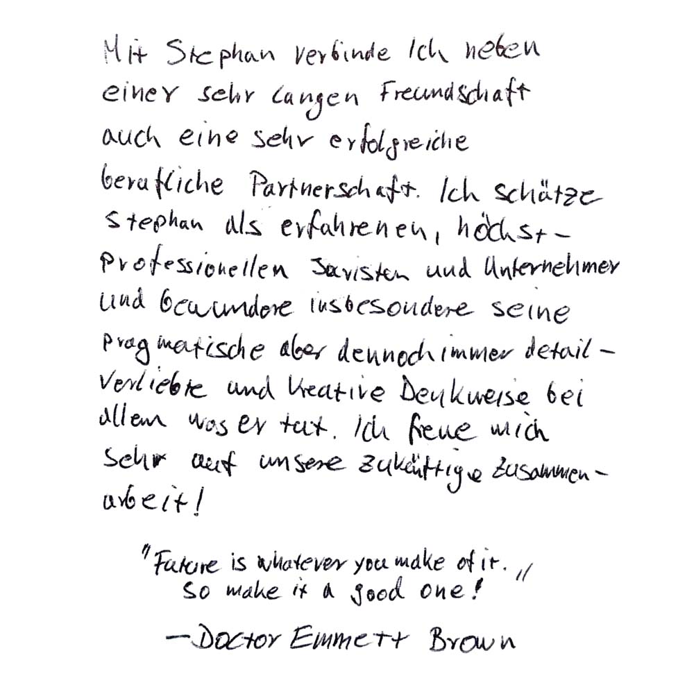 Kreativität ist Intelligenz, die Spaß macht (A. Einstein). Dieses Zitat passt gut auf meinen langjährigen Freund und Weggefährten Stephan! Ganz gleich, ob es um die professionelle Bearbeitung juristischer Sachverhalte, das Erschließen neuer Geschäftsfelder oder das Bewerten von Geschäftsideen geht – Stephan ist stets ein wertvoller, fruchtbarer Gesprächspartner, der mit Kreativität und Intelligenz die richtigen Worte und Lösungen findet!