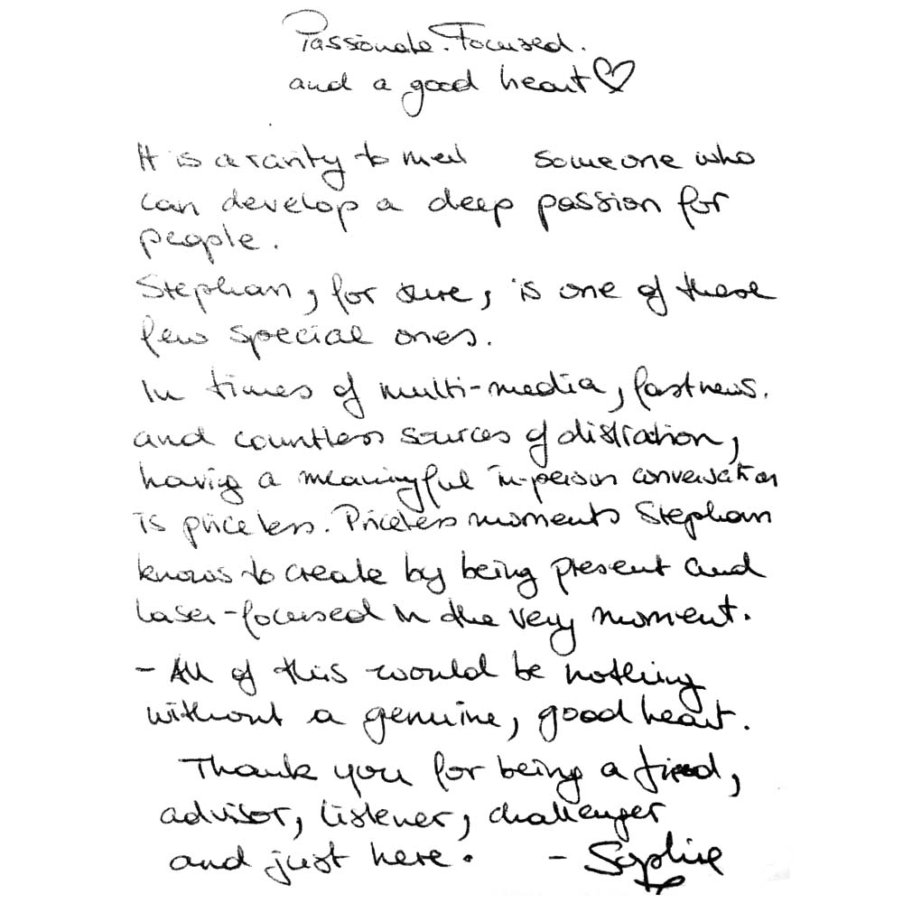 It is a rarity to meet someone who can develop a deep passion for people. Stephan, for true, is one of those few special ones. In times of multi-media, fast news and countless sources of distortion, having a meaningful in-person conversation is priceless. Priceless moments Stephan knows to create by being present and laser-focused in the very moment.