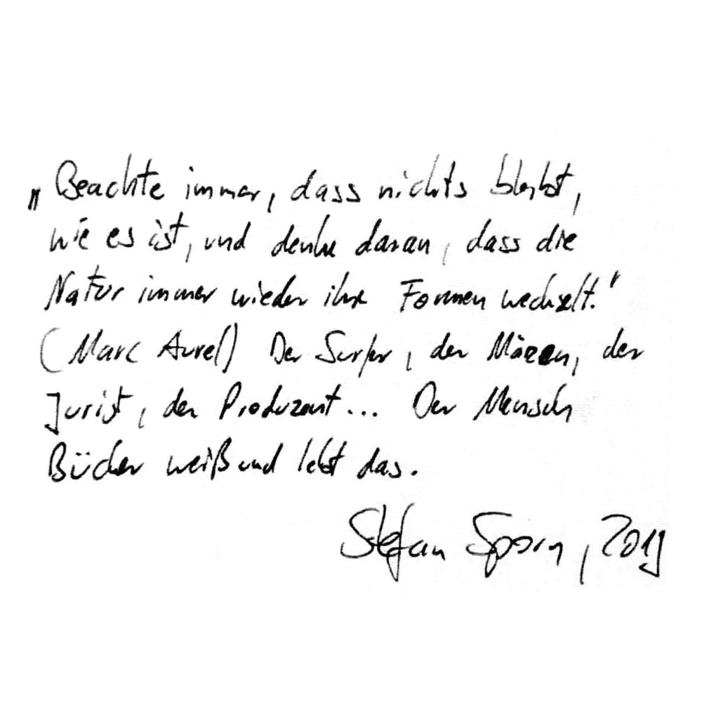 ‚Beachte immer, dass nichts bleibt, wie es ist, und denke daran, dass die Natur immer wieder ihre Formen wechselt.‘ (Marc Aurel) Der Surfer, der Mäzen, der Jurist, der Produzent … Der Mensch Bücker weiß und lebt das.